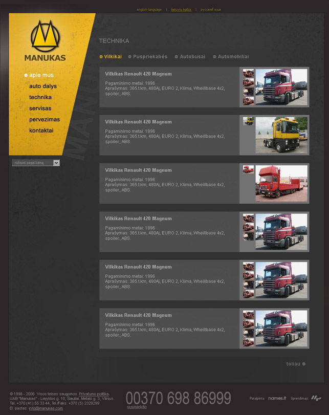 UAB „Manukas“, užsiimančiai krovininių automobilių, vilkikų bei jų dalių prekyba ir remontu, buvo sukurtas interneto puslapis MANUKAS.COM. Kuriant MANUKAS.COM buvo parengtas individualus svetainės dizainas, atlikti xHTML karpymo bei JavaScript ir kiti programavimo darbai, įdiegta turinio valdymo sistema FLY-JET, kontaktų modulis, žemėlapiai, produkcijos katalogas, produkcijos rūšiavimo pagal pasirinktą kriterijų funkcija.